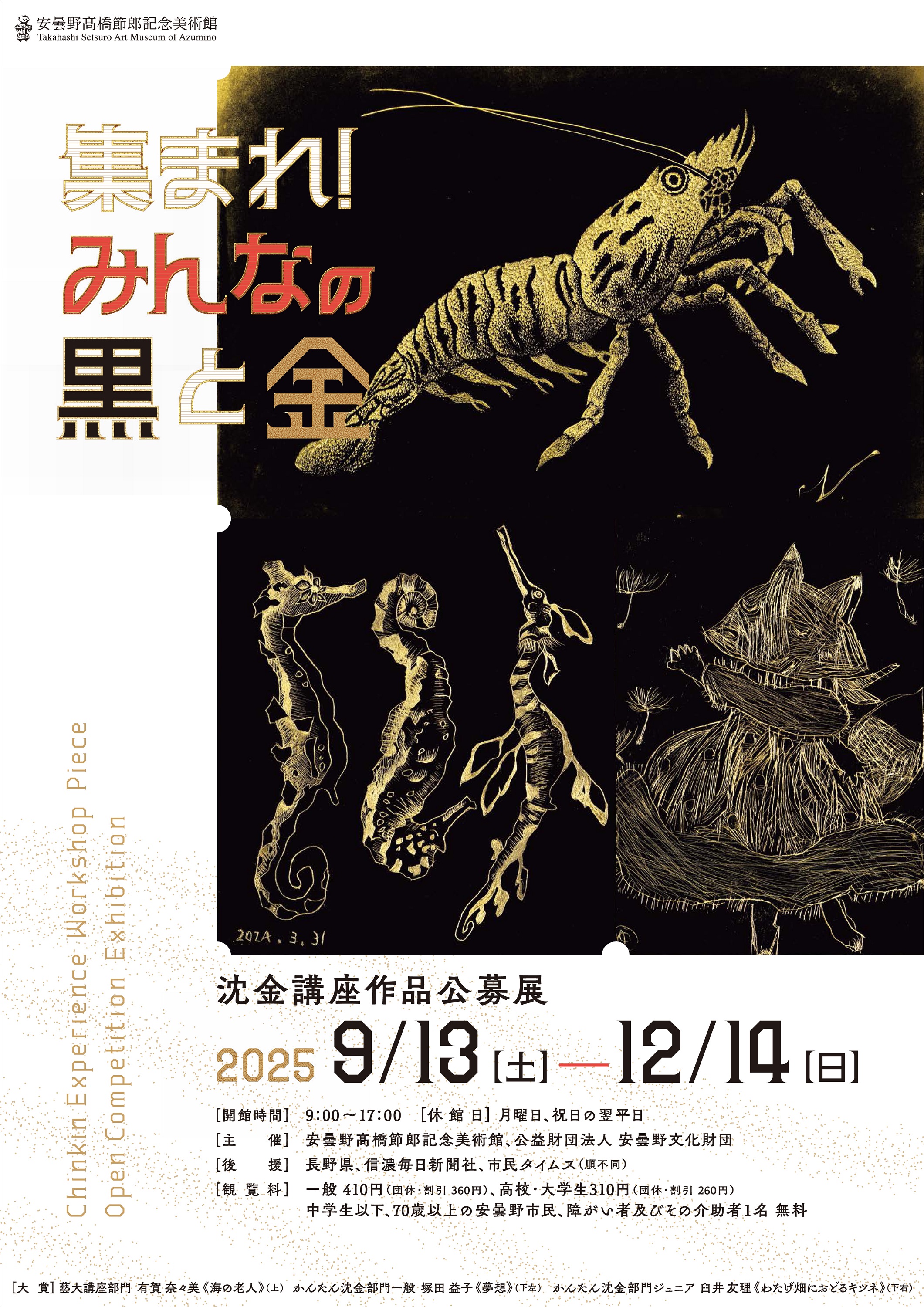 当館の人気講座、「東京藝大講座」「かんたん沈金体験」受講者の皆さんの作品を公募し、入選作品を下記展覧会にて展示いたします。髙橋節郎作品、講座の講師作品と共にご高覧ください。 . 展覧会名 沈金講座作品公募展 会 期 9月13日(土) ~ 12月14日(日) 表 彰 式 9月14日(日) 休 館 日 月曜日、祝日の翌平日 主 催 安曇野髙橋節郎記念美術館、公益財団法人 安曇野文・・・