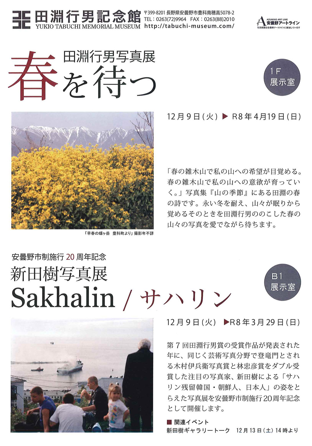 田淵行男写真展「春を待つ」 12月9日~R8年4月19日 長い冬を耐え、山々が眠りから覚めるそのときを田淵行男ののこした春の山々の写真を愛でながら待ちます。 安曇野市制施行20周年記念 新田樹写真展「Sakhalin/サハリン」 12月9日~R8年3月29日 木村伊兵衛写真賞と林忠彦賞をダブル受賞した注目の写真家、新田樹によるサハリンの人々をとらえた写真展。 関連イベント「新田樹ギャ・・・