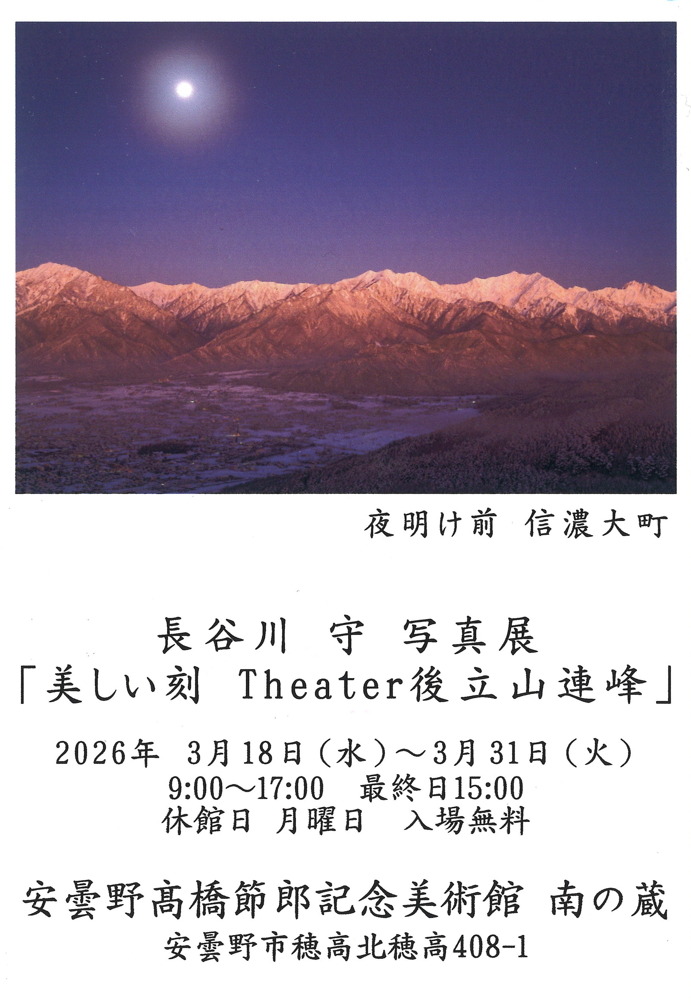 南の蔵で開催される写真展のご案内です。 長谷川 守氏の作品世界をどうぞお楽しみください。 . ■会期 2026年3月18日(水)~3月31日(火) ■時間 9:00~17:00 最終日は~15:00 ■休館 月曜日 ■会場 南の蔵 ■入場 無料