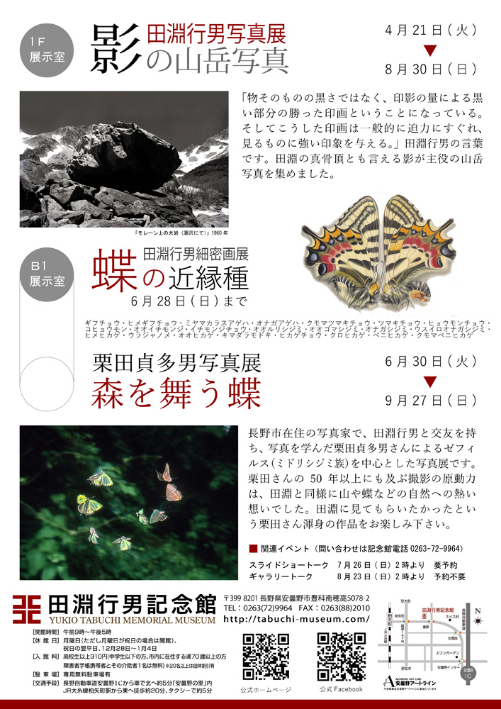 田淵行男写真展「影の山岳写真」 1階展示室にて 8月30日(日)まで 「物そのものの黒さではなく、印影の量による黒い部分の勝った印画ということになっている。そしてこうした印画は一般的に迫力にすぐれ、見るものに強い印象を与える。」田淵行男の言葉です。田淵の真骨頂とも言える影が主役の山岳写真を集めました。 田淵行男細密画展「蝶の近縁種」 地階展示室にて 6月28日(日)まで 田淵行男の残・・・