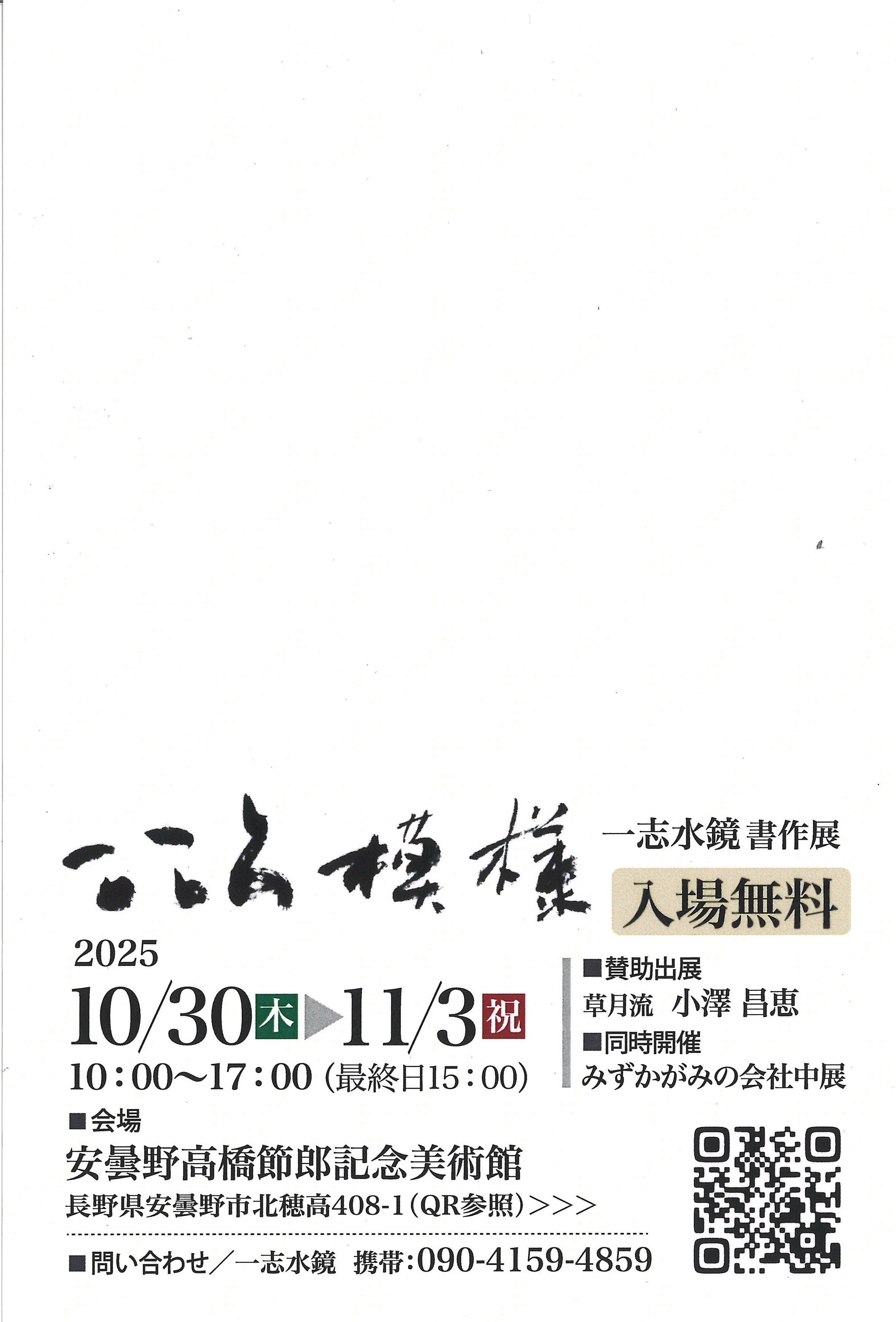今年も一志水鏡さんによる書作展と「みずかがみの会」社中展が同時開催されます。草月流 小澤昌恵さんによるいけばな作品もお楽しみください。