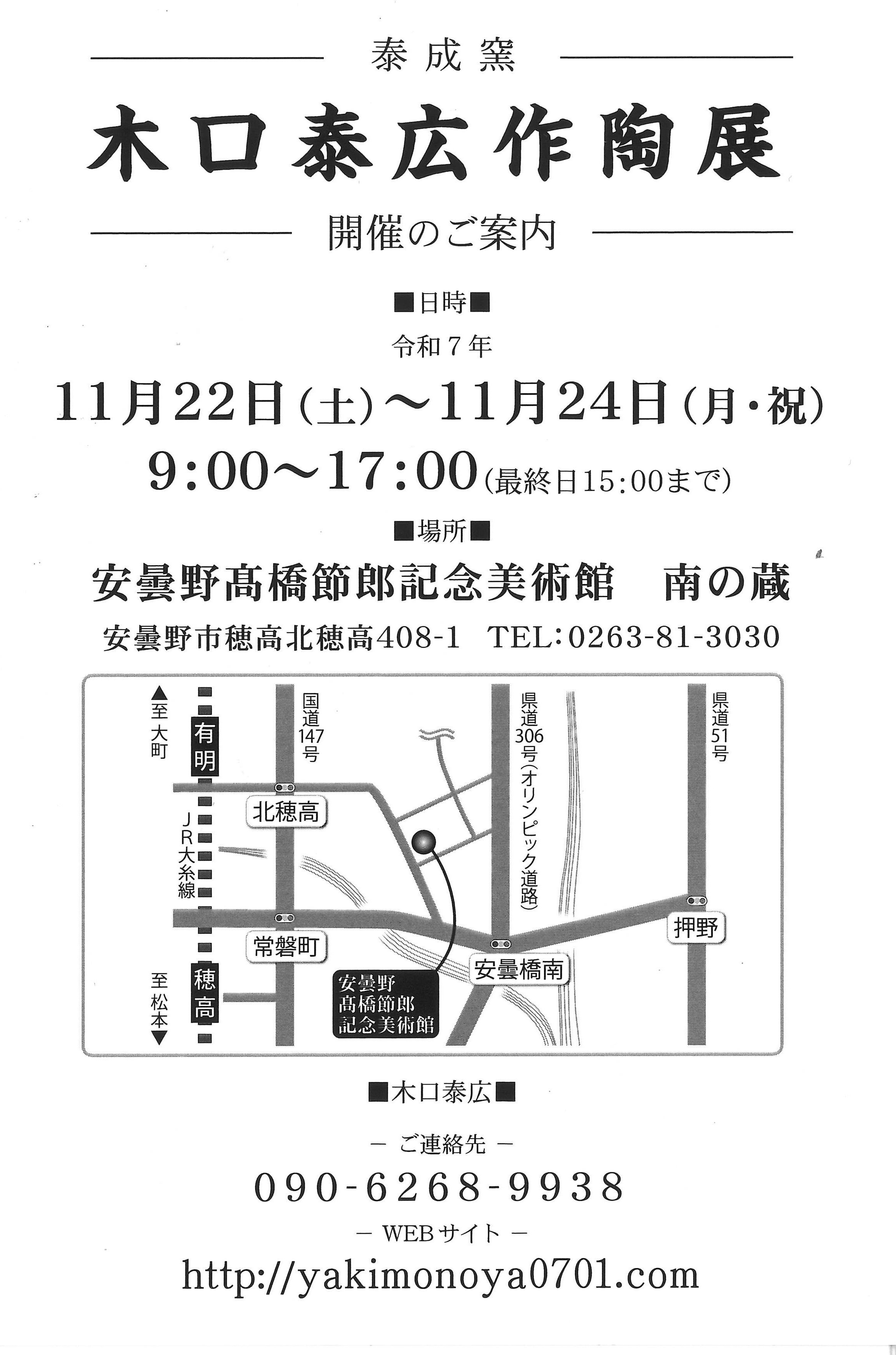 泰広窯 木口泰広作陶展を開催します。今回はどんな作品が並ぶのか楽しみですね。